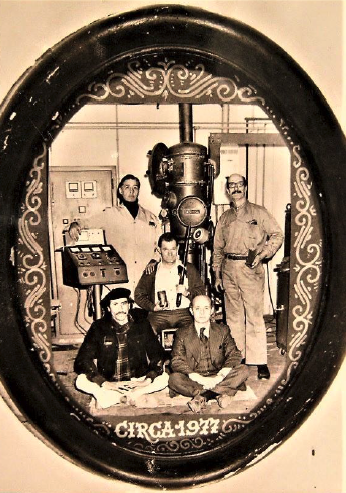 Orgullo de Juan Carlos (abajo, a la derecha con corbata y chaleco):los primeros lingotes de circonio (en la mano de la persona en el centro). Arriba, der. Don Mario, izq. Arnoldo Leyt, Abajo izq. Ricardo Volpi.