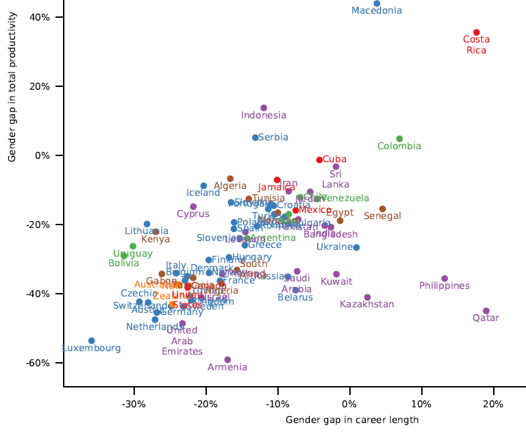 No digo mucho más, porque hay tantas cosas para mirar en lo que midieron, que creo que cada uno elegiría distintos puntos donde enfocar. Por ejemplo, y sólo porque el gráfico es muy lindo, el gap en la duración de la carrera está muy correlacionado con el gap en productividad (aunque el gap en la duración es mayor que el gap de las edades jubilatorias, hasta donde se puede ver).